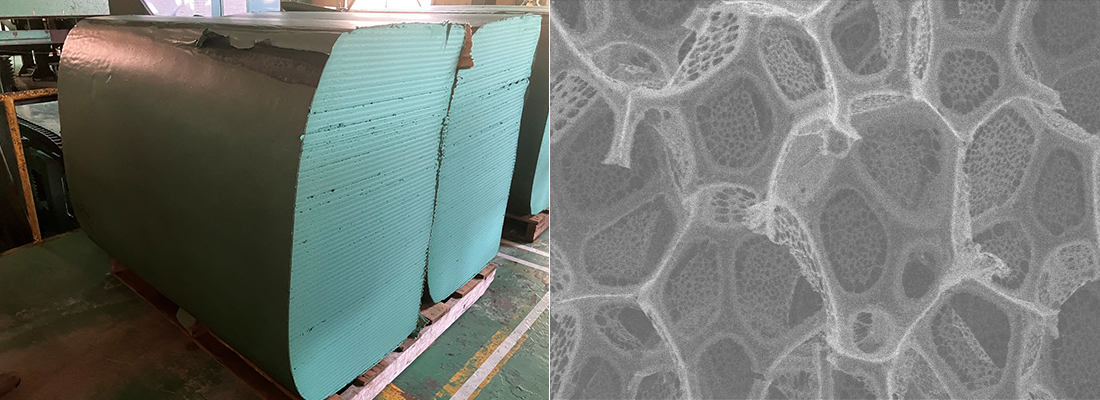フェノール樹脂の特性を生かし液体の状態から膨らませて発泡体にしています。見た目では分からないかも知れませんが、細かなミクロのカプセルが積みあがった発泡体です。そしてそのカプセルの一粒、一粒が接する部分には穴が開いており、これを連続気泡体と言います。この連続気泡体をベースにした製品を製造しているのは日本では唯一松村アクア株式会社だけです。